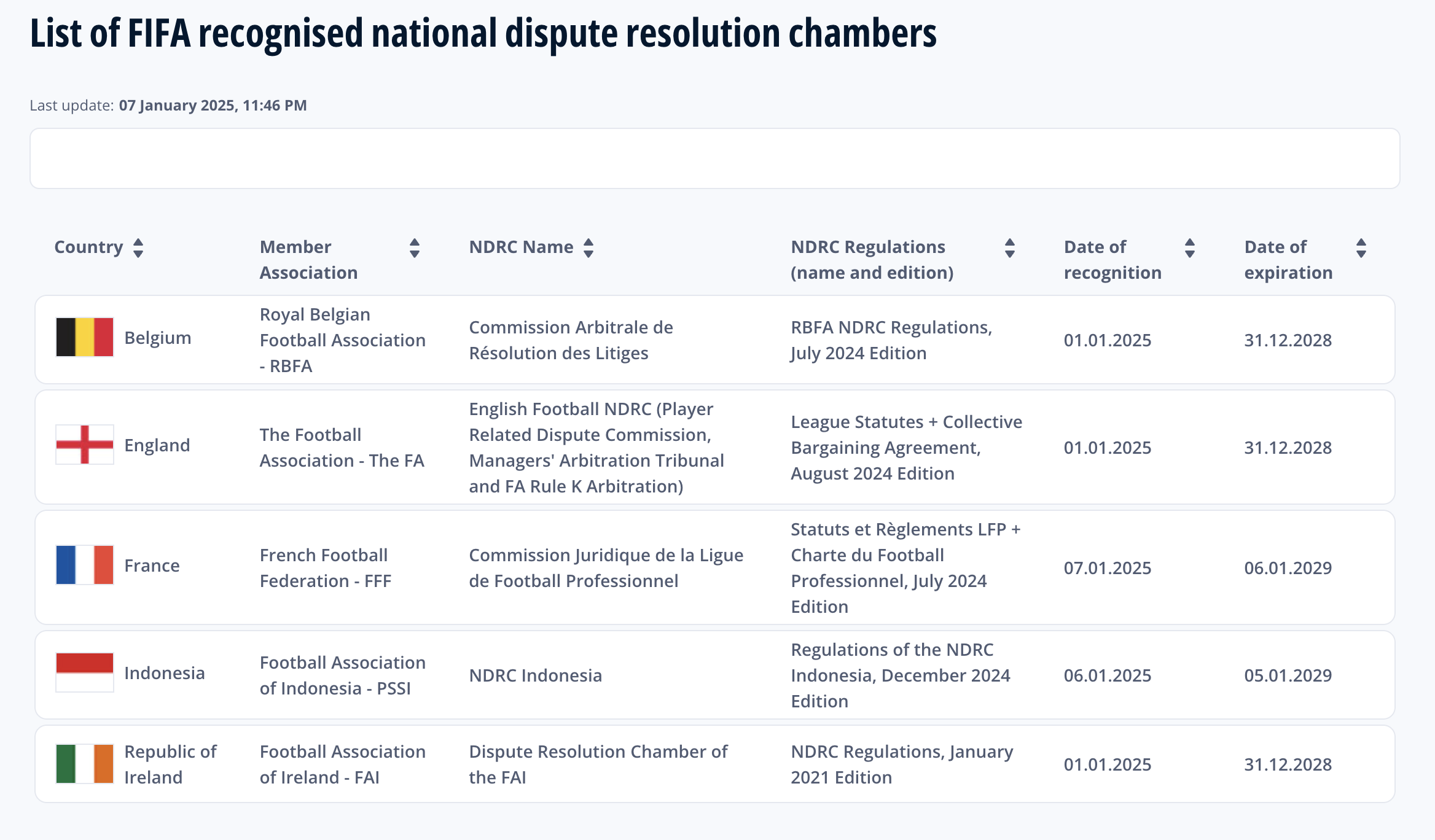 Negara-negara yang memperoleh pengakuan serupa adalah Royal Belgian Football Association (RBFA), The Football Association (FA) dari Inggris, French Football Federation (FFF) dari Prancis, dan Football Association of Ireland (FAI) dari Republik Irlandia. Dengan pengakuan ini, PSSI semakin memperkuat komitmennya untuk melindungi kontrak pemain dan pelatih.